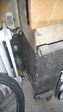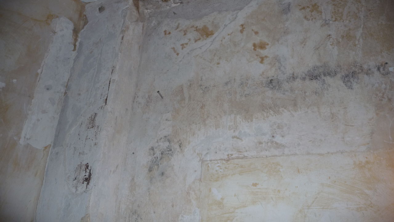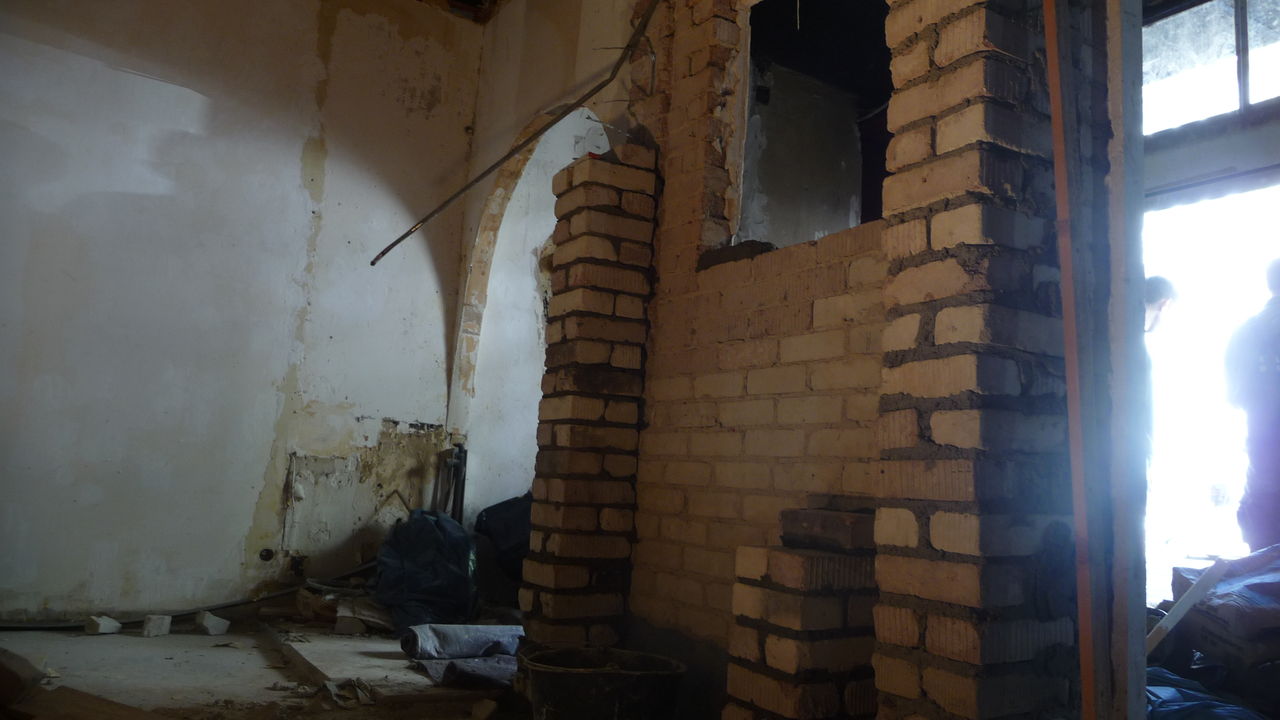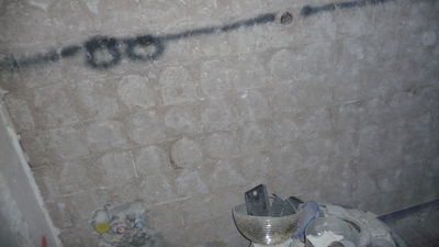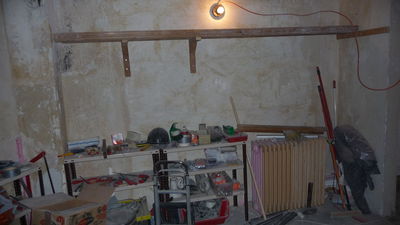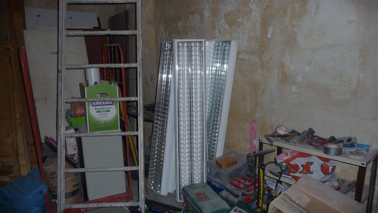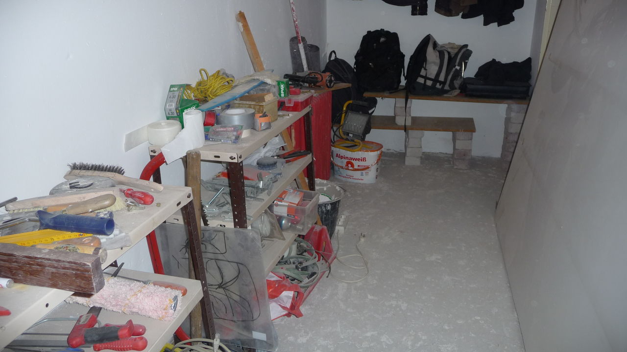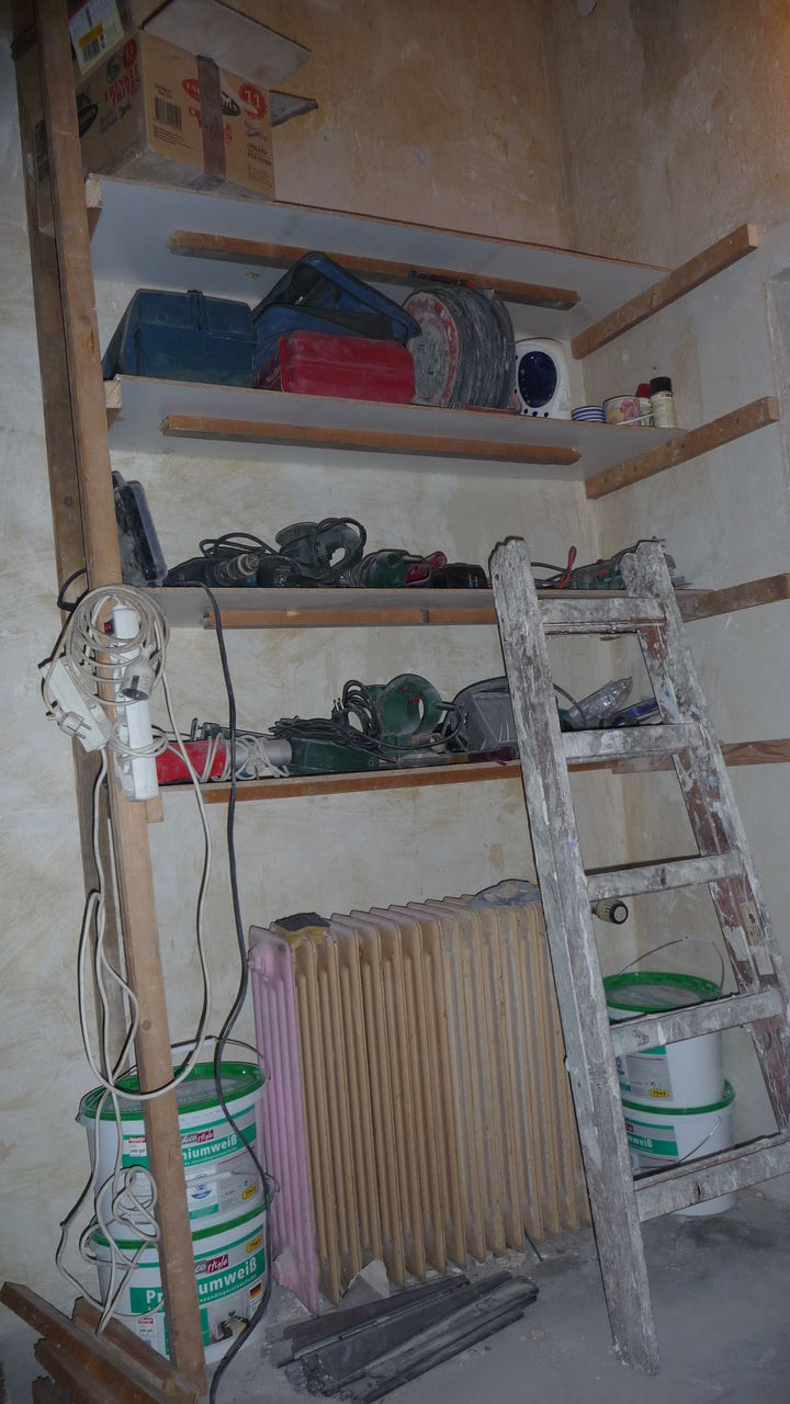 Das bisherige Regal wurde demontiert und das Werkzeug aus dem Lager in den Durchgang getragen. Denn in diesem Bereich musste der Putz erneuert werden.
