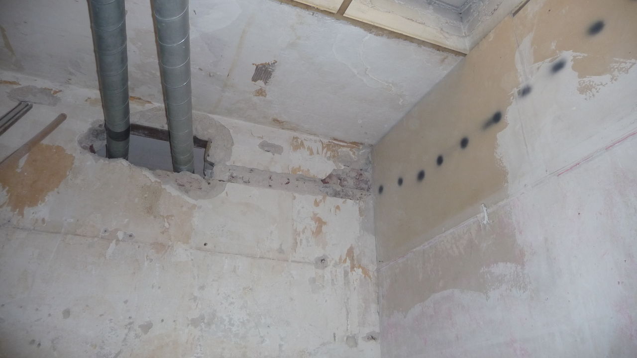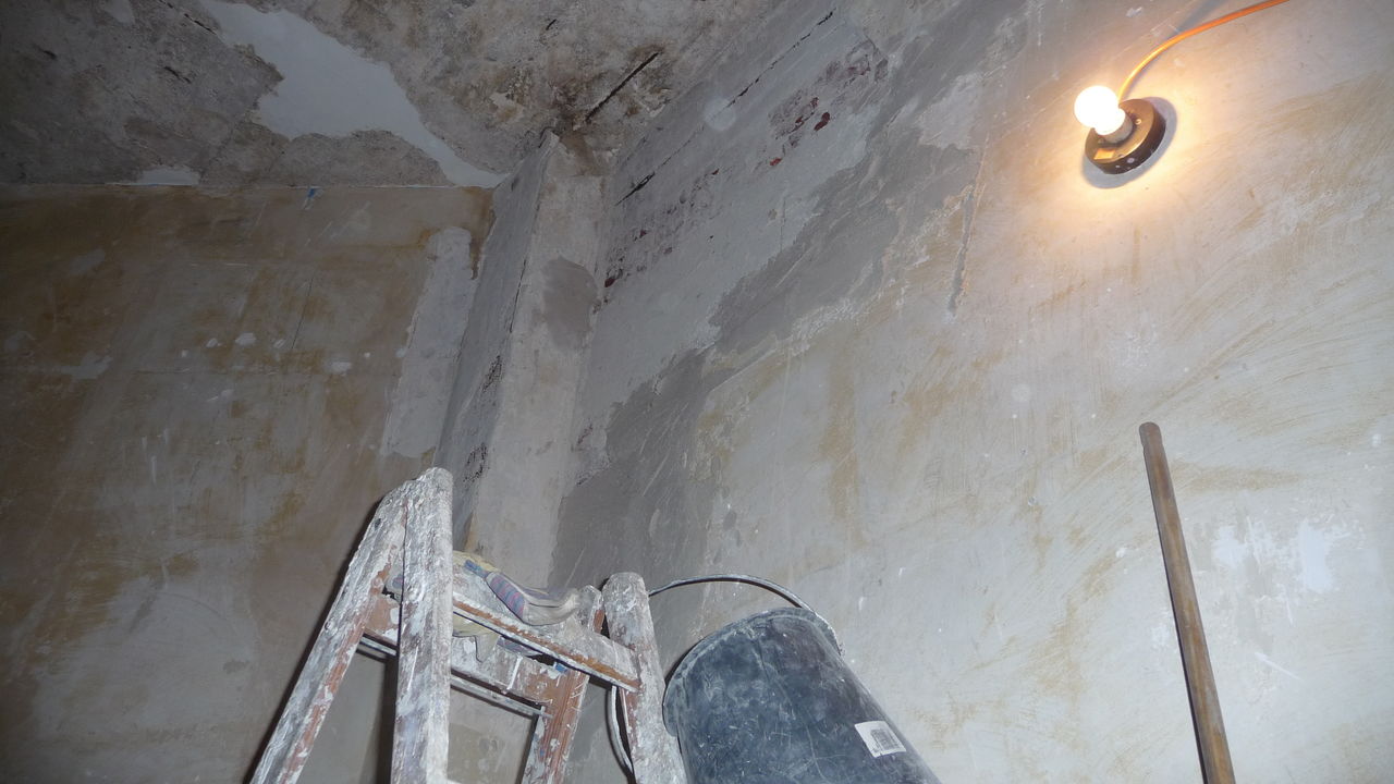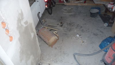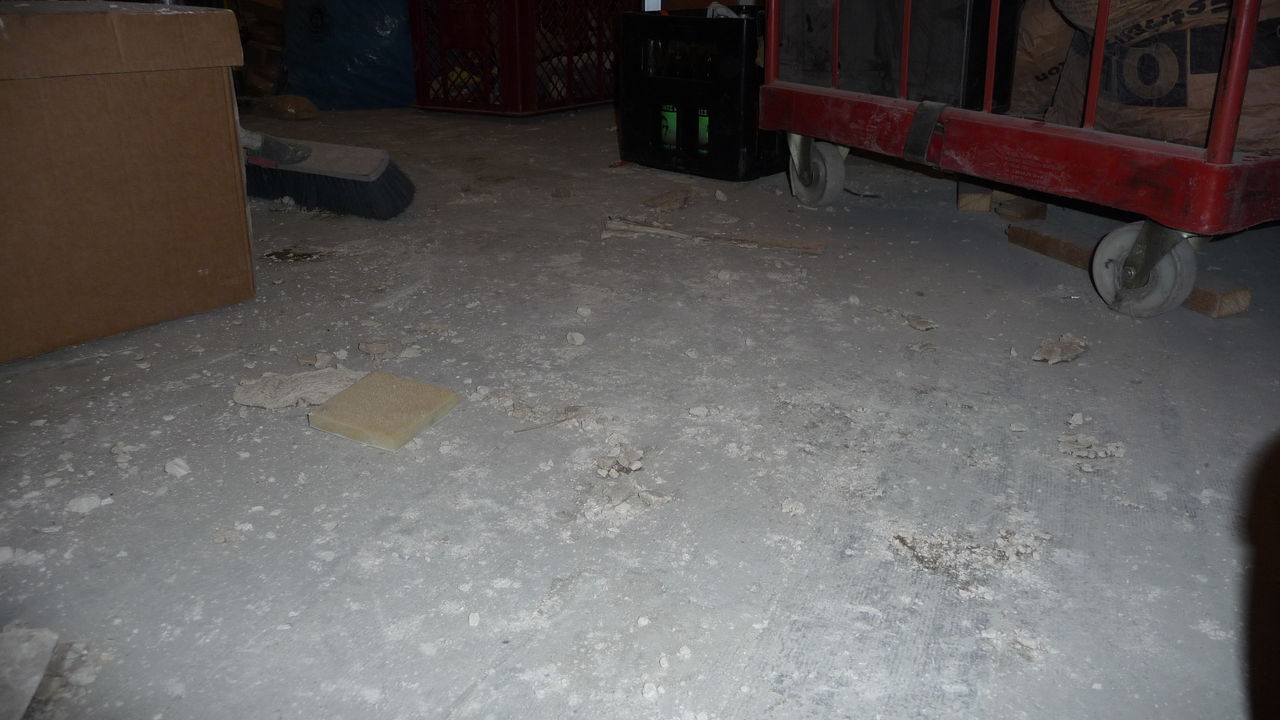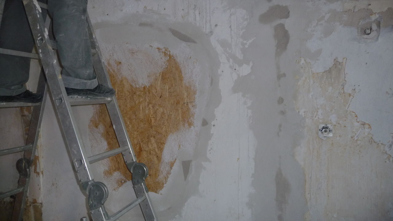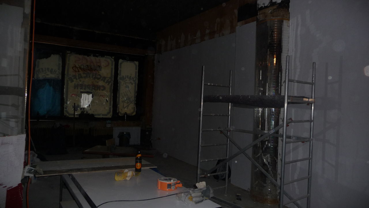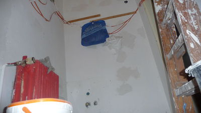 Weiterführung der Arbeiten von gestern. Die Decke im Lager ist nun teilweise gefixt (was unter starker Dreckentwicklung am Boden geschah). Auch das ehemalige Lüftungsloch in der Küche ist zu (allerdings schon etwas länger).