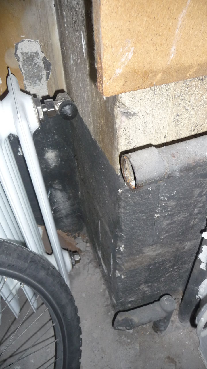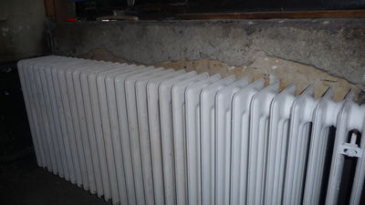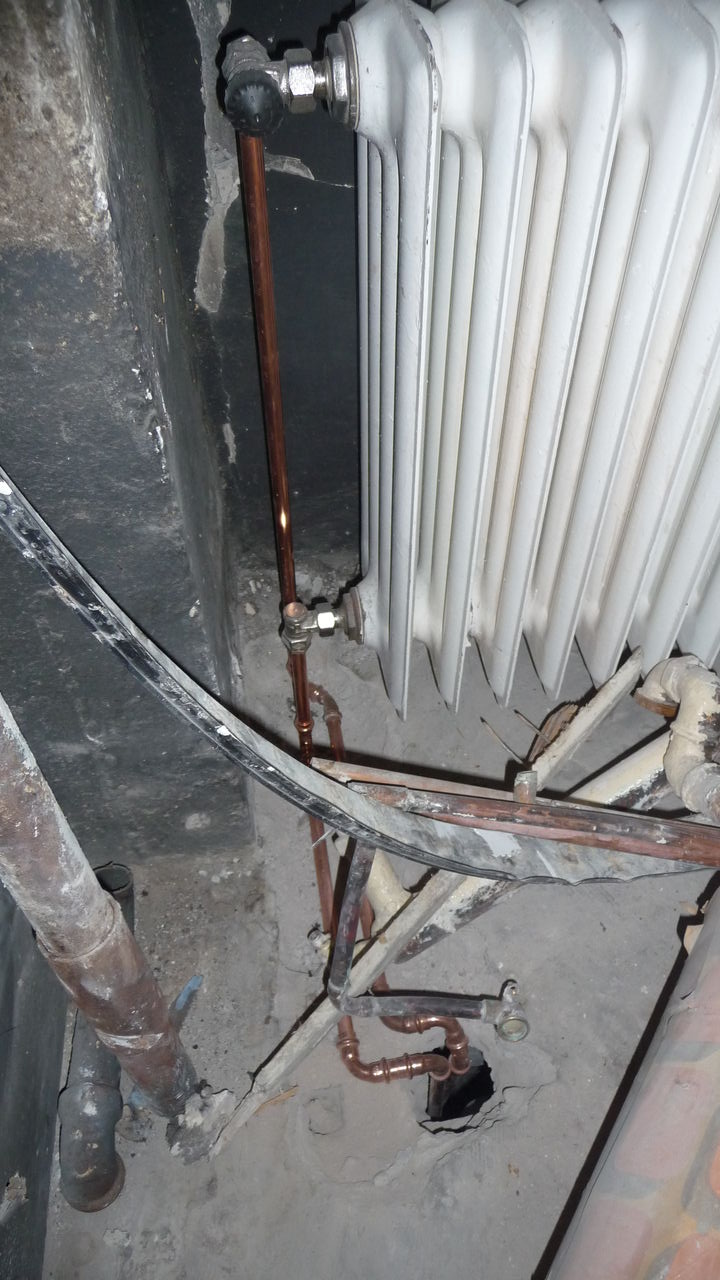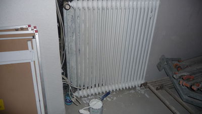 Externe Handwerker haben sich die Heizkörper vorgeknöpft. Der Heizkörper vorm Klo wurde demontiert, allerdings nur temporär, schließlich befinden sich dort neue Rohre. Der Heizkörper neben der Tür wird dagegen nicht mehr in Betrieb genommen, steht nutzlos im Weg rum und wartet auf Verschrottung. Auch an den Heizkörpern am Fenster wurde gearbeitet, allerdings wurde nur der linke angeschlossen.