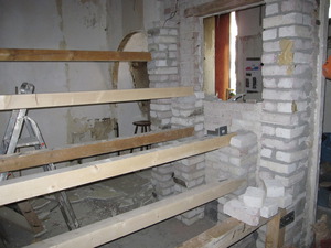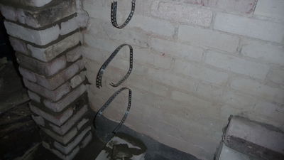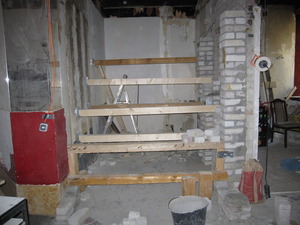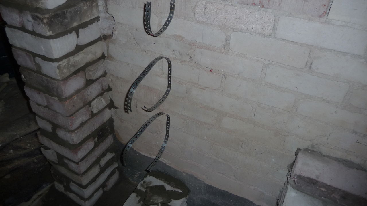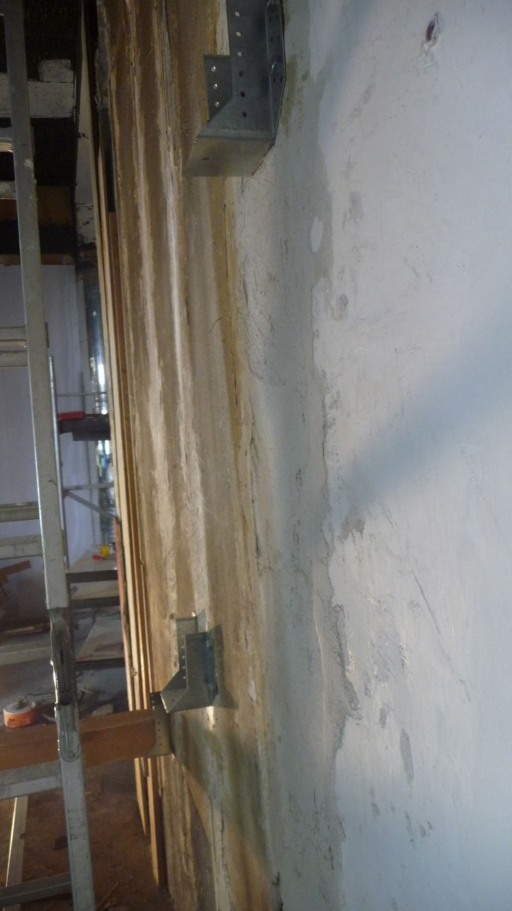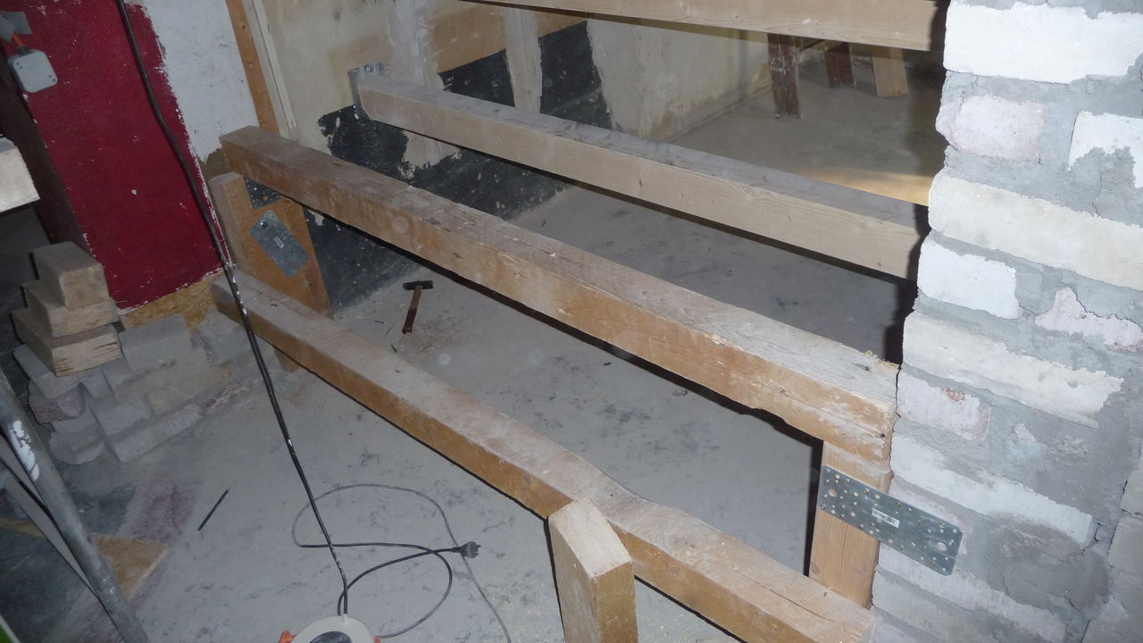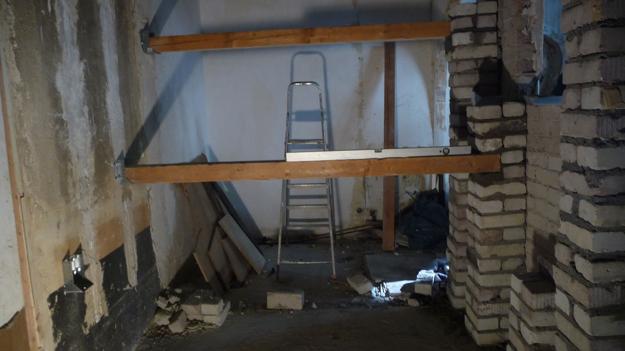 Mittlerweile ist klar, dass bei der ehemaligen Sitzecke eine Sitztreppe entstehen wird. Für die Balken, auf denen die Stufen aufliegen, werden auf der Seite der Eingangstür Stützen gemauert. Die Lochstreifen verbinden diese Stützen mit der existierenden Wand. Auf der anderen Seite werden Metallschuhe in der Wand verankert. Die Wand wird später noch in ihrer Höhe reduziert.