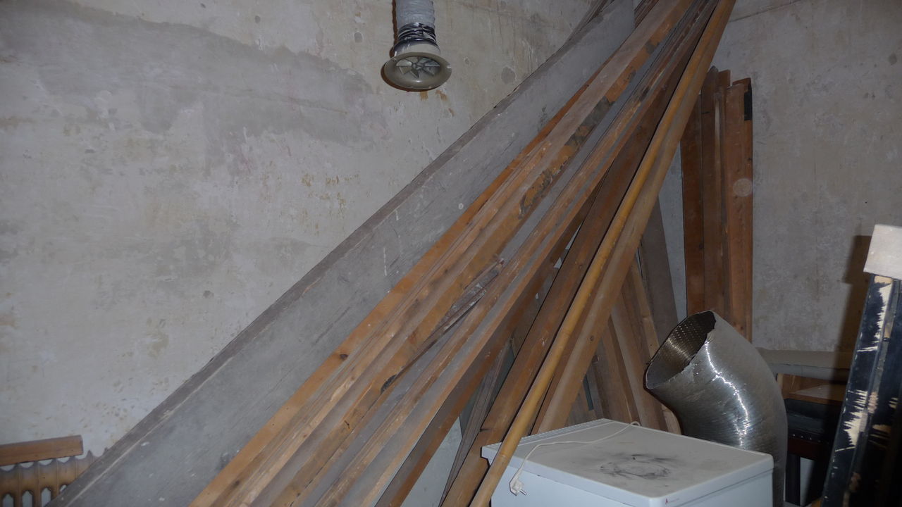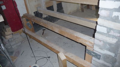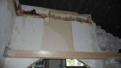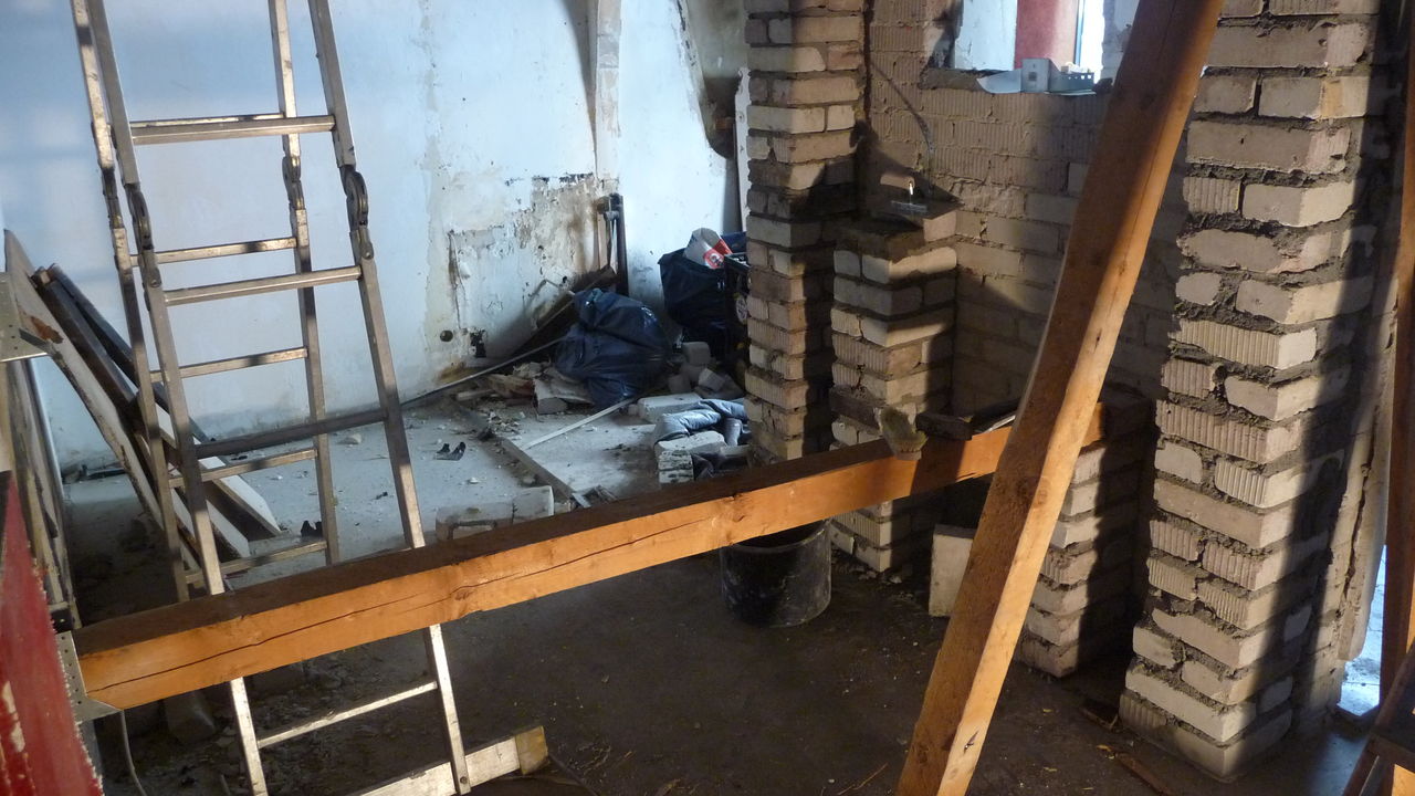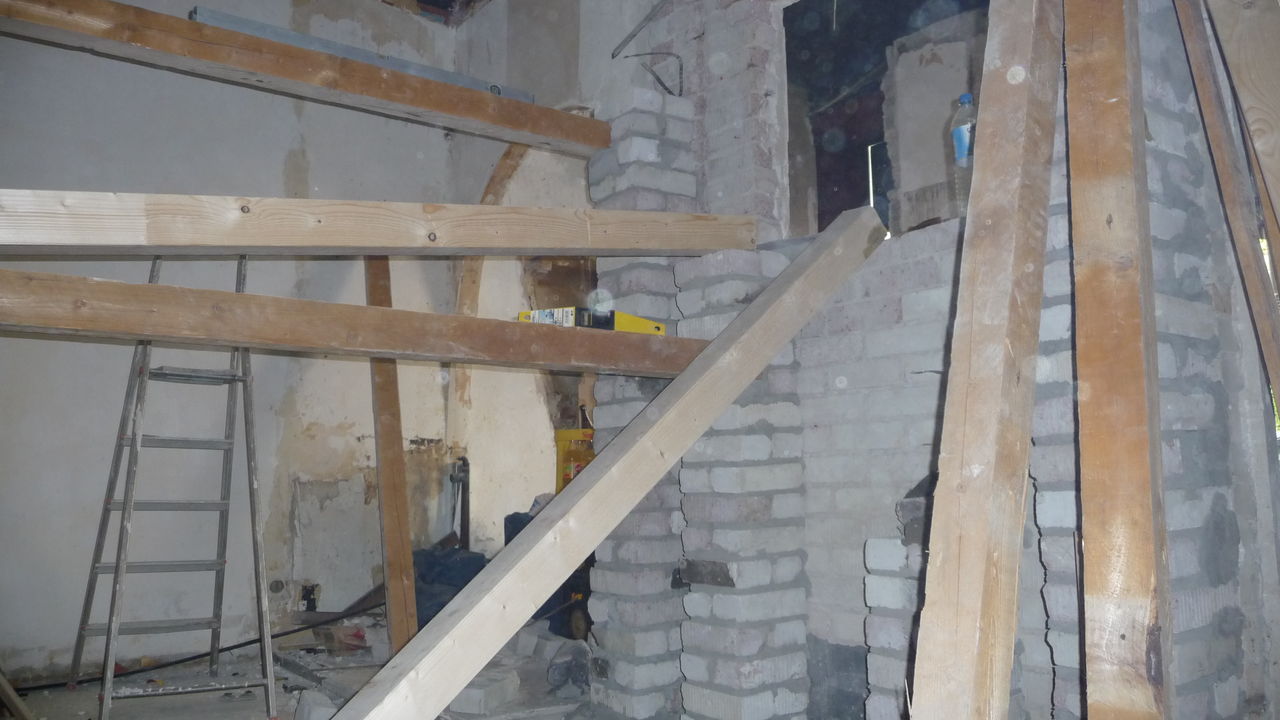 Sichtbarer Fortschritt bei der Treppe. Die Wand wurde zum Teil abgebrochen, auch die Säule wurde gekürzt. Holz für die Stufen ist eingetroffen und lagert vorn zur baldigen Montage. Für die oberste Stufe wurde ein Balken aufgelegt. Bisher sind nicht alle Balken verschraubt.