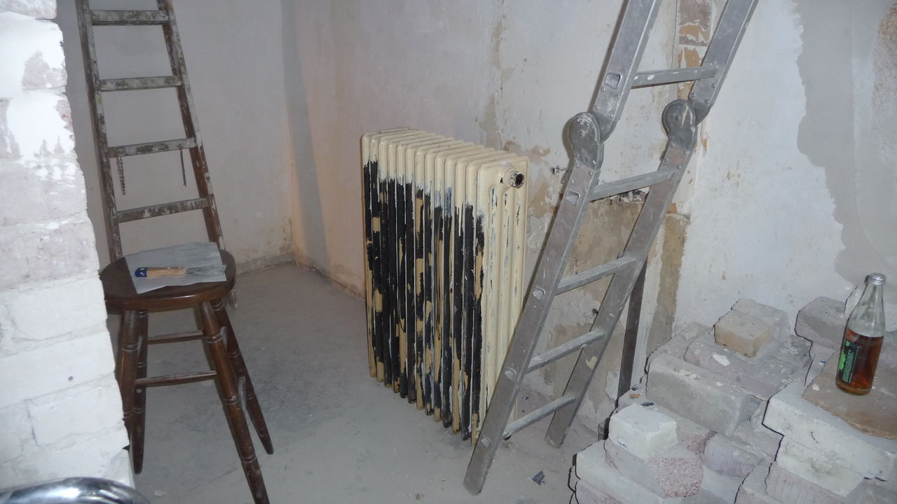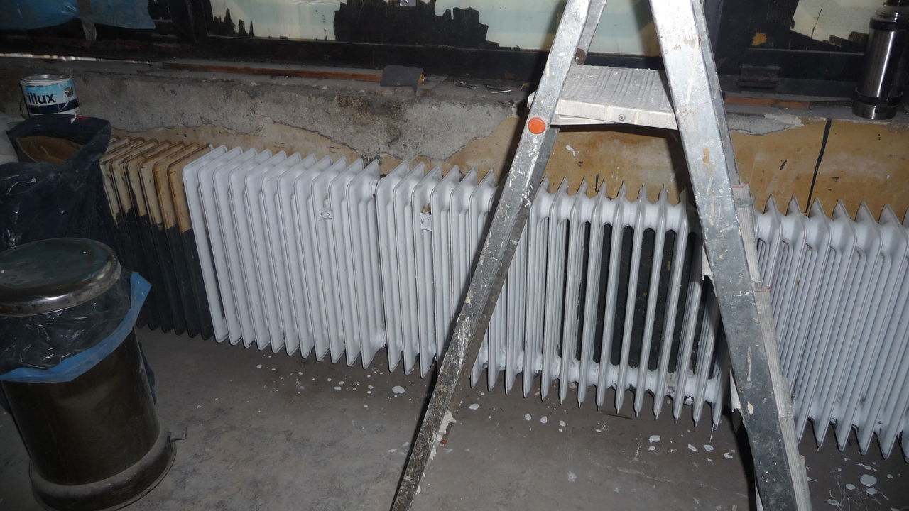 Auch heute wieder wurde viel Arbeit in das Lackieren der Heizkörper und das Fixen der Decken gesteckt. Die alten gerippten Heizkörper sind alles andere als wartungsfreundlich, zumal sie bis zu drei mal lackiert werden müssen.
