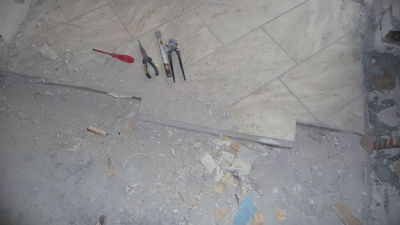 In der Küche werden die alten Fliesen entfernt.
