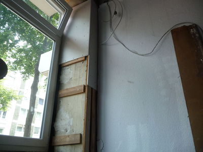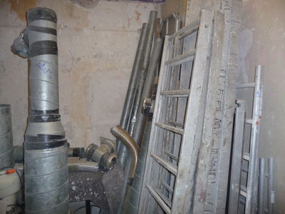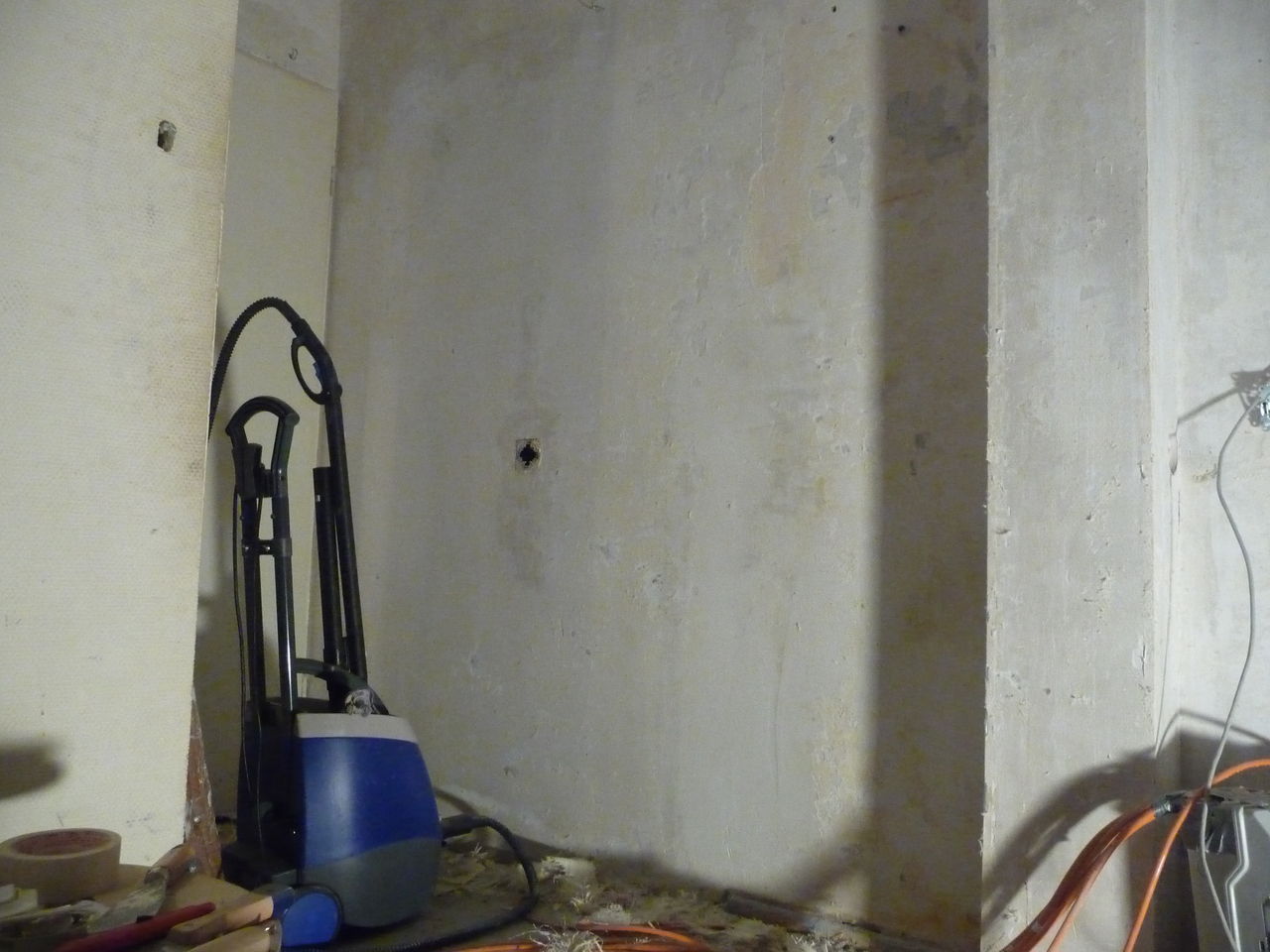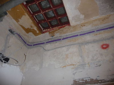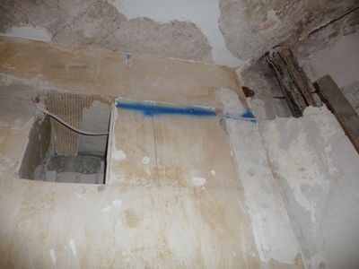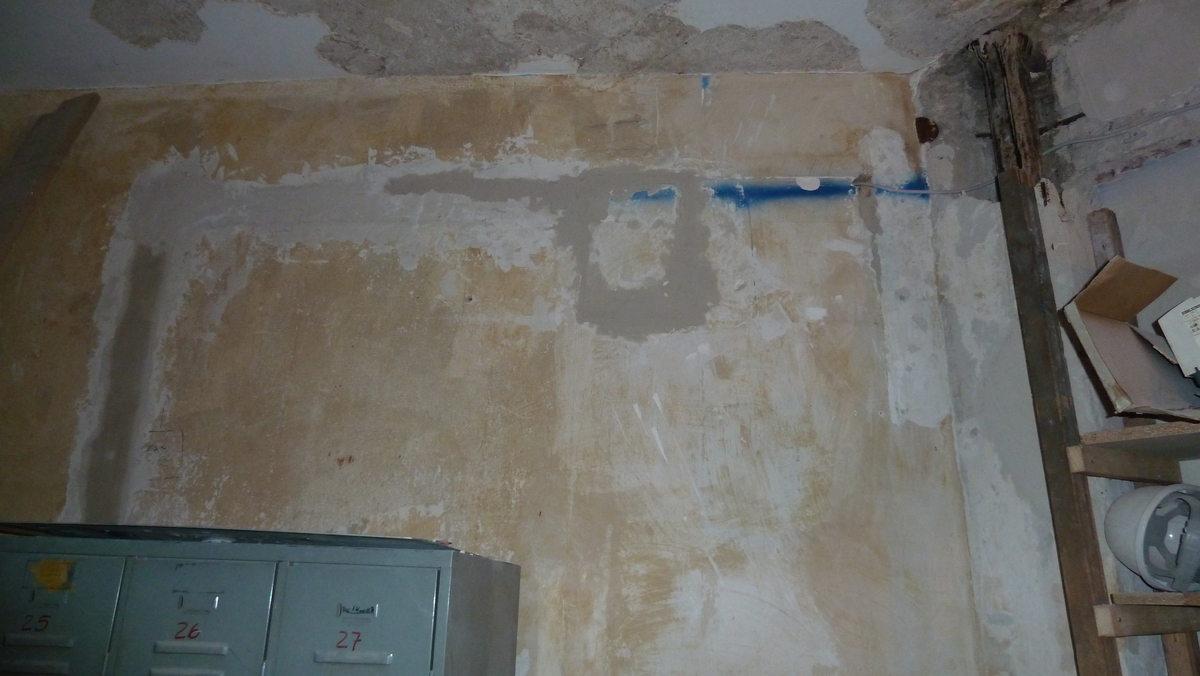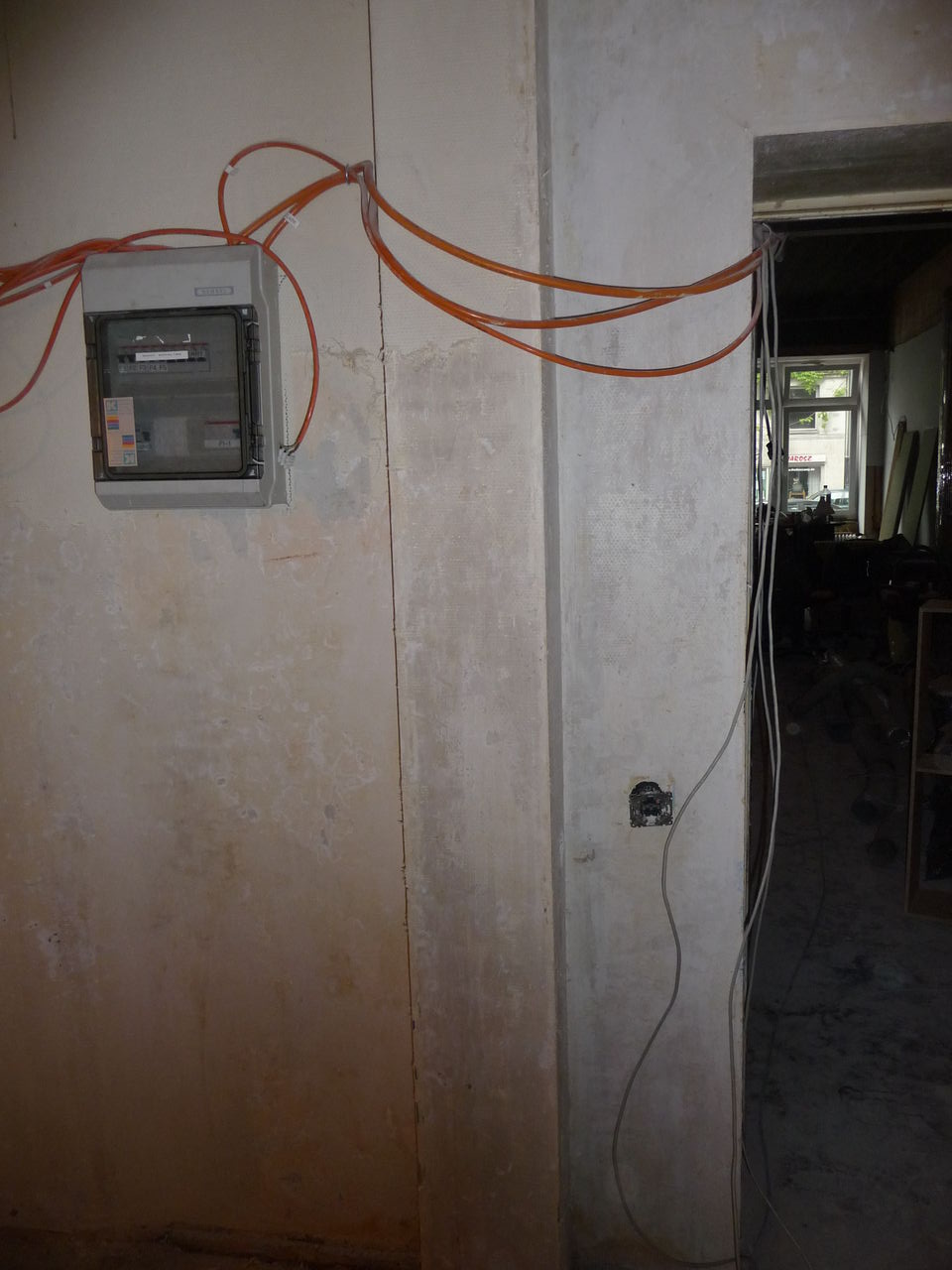 Eine Wand im großen Lager musste freigeräumt werden, damit auch dort Strom aus der Steckdose kommen kann. Man sieht hier auch ein zugemauertes (vermutliches) ehemaliges Fenster sowie ein lustig buntes Regenwasserfallrohr. Immerhin konnten wir das Kabel durch's Loch in der Wand führen, der restliche Kabelweg wurde sogar schon (solange die Putzreste reichten) verputzt.