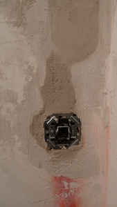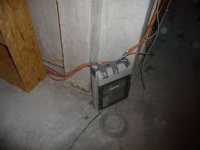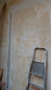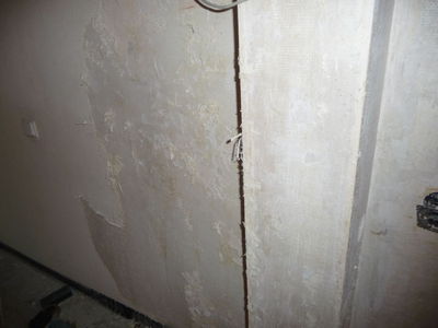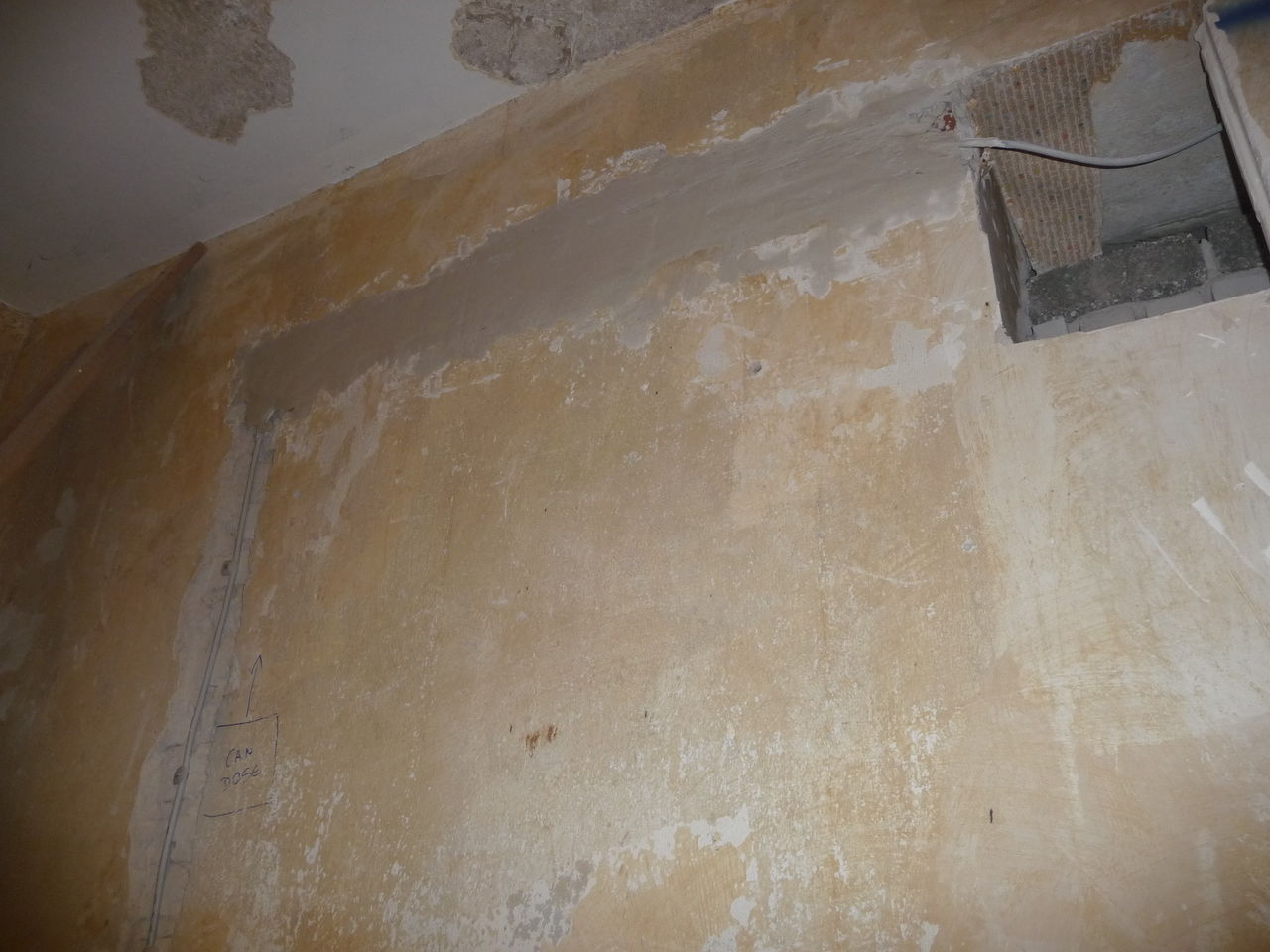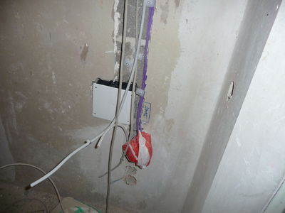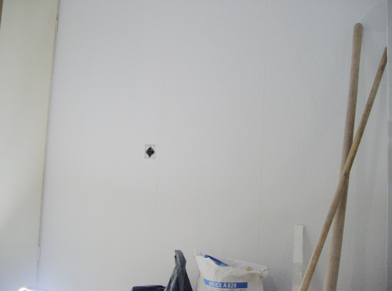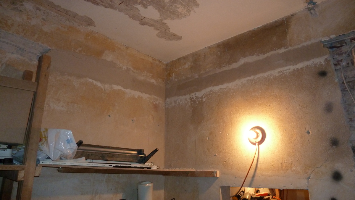 Eine Wand im großen Lager musste freigeräumt werden, damit auch dort Strom aus der Steckdose kommen kann. Man sieht hier auch ein zugemauertes (vermutliches) ehemaliges Fenster sowie ein lustig buntes Regenwasserfallrohr. Immerhin konnten wir das Kabel durch's Loch in der Wand führen, der restliche Kabelweg wurde sogar schon (solange die Putzreste reichten) verputzt.