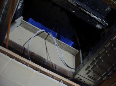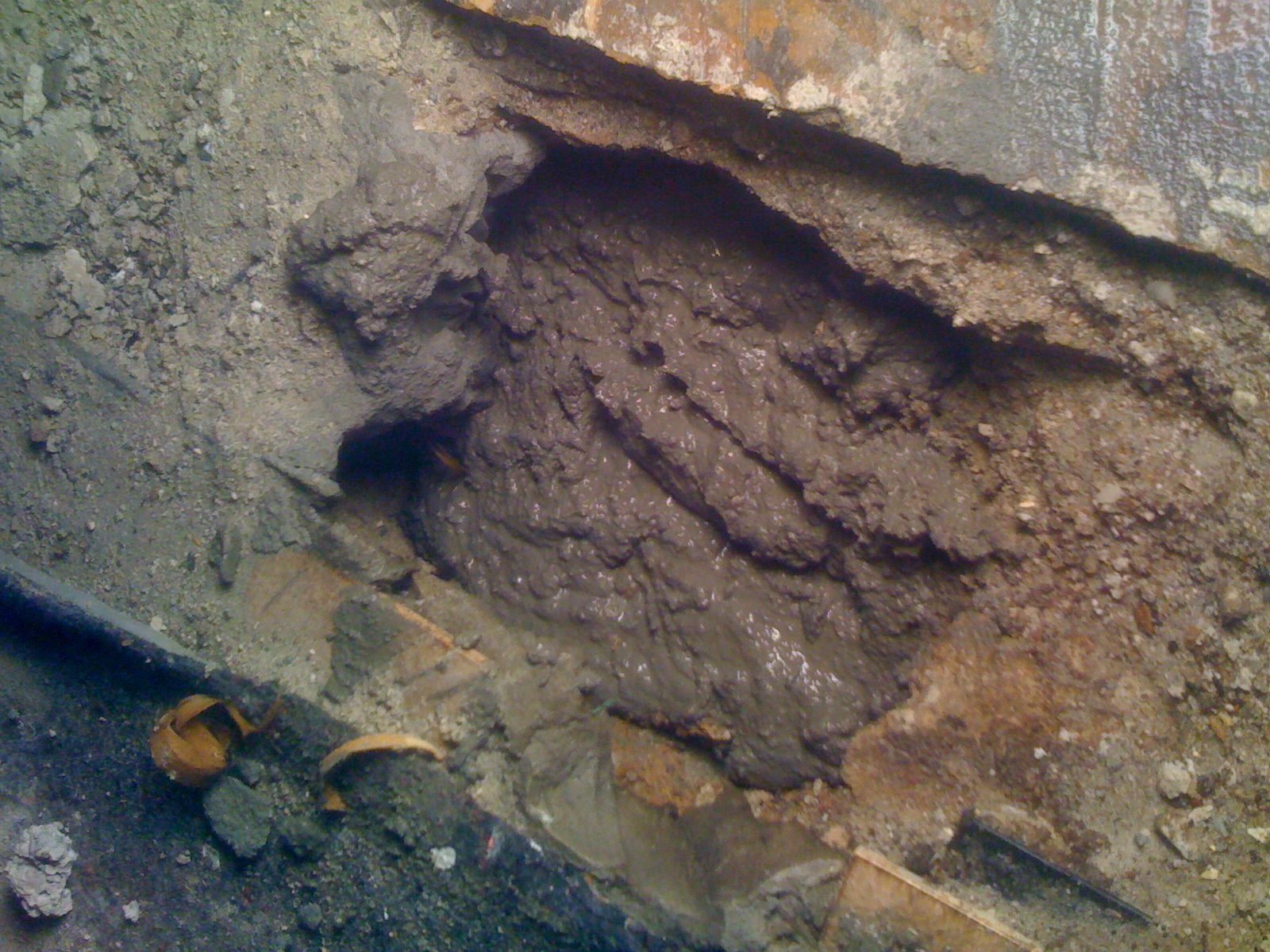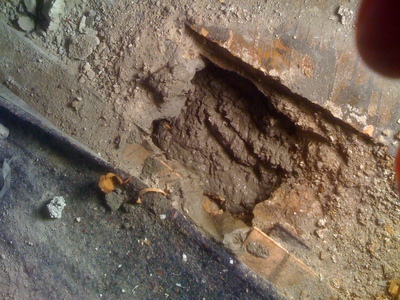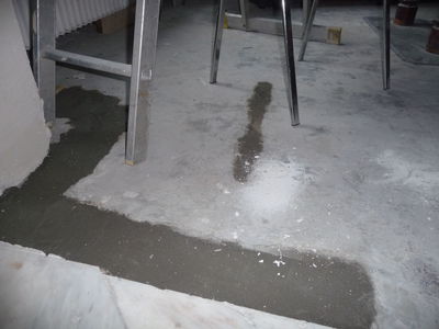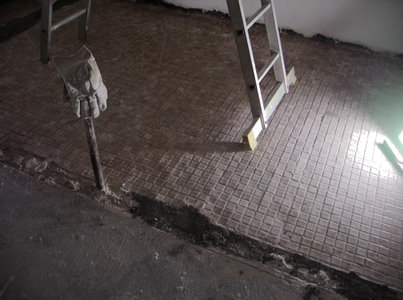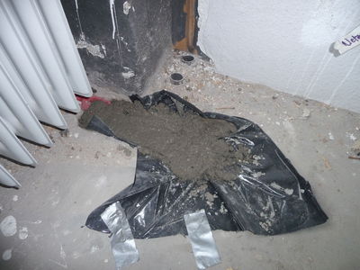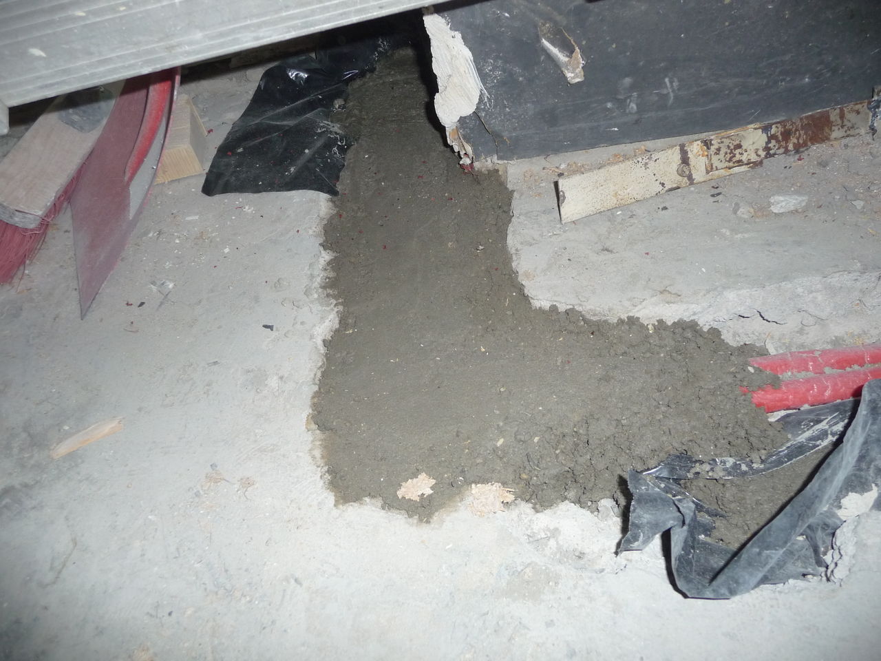 Mitlerweile wurde ein Loch im Boden der Küche verschlossen. In dem Loch waren das alte Wasserrohr und ein Stromkabel, mit dem schon unangenehme Erfahrungen gemacht wurden. Vom Keller aus wurde eine Platte gegengeschraubt und das Loch mit Zement verfüllt.