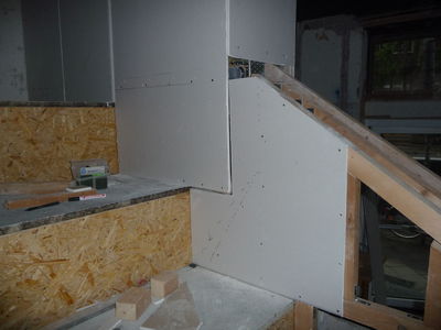 An der Treppe wurde die Holzlattenkonstruktion für die Verkleidung im unteren Bereich vollendet. Einige Platten wurden nach anfänglichen Positionierungsproblemen doch noch befestigt.