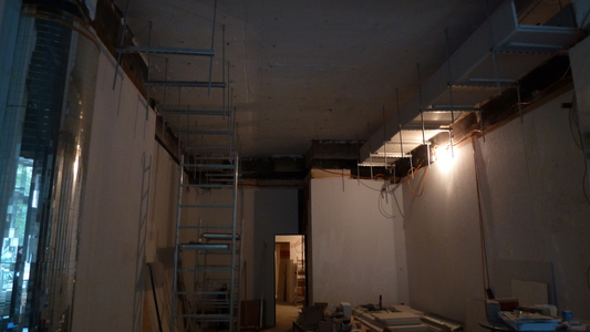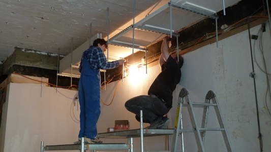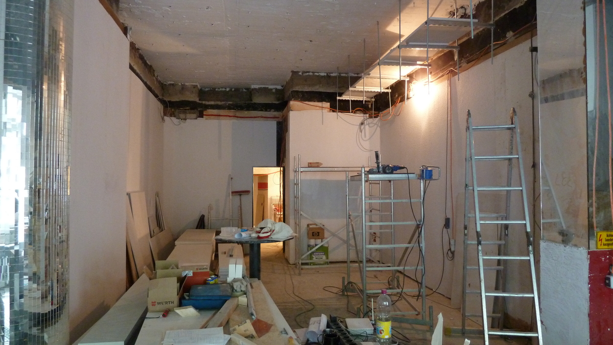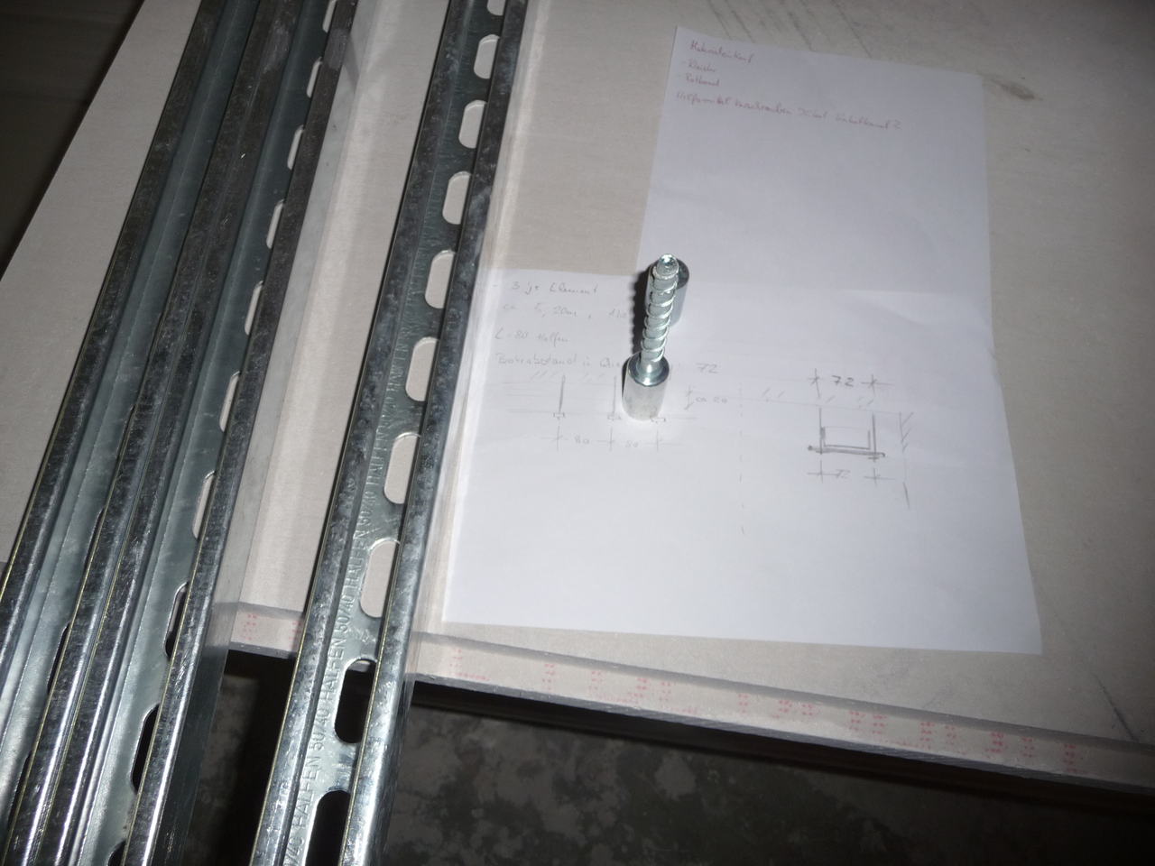 Im Hauptraum stapeln sich aktuell Platten, Metallstreben und Betondübel. Es gab zuerst Zweifel, ob die Dübel (Gewindeschrauben, welche in ein vorgebohrtes Loch kommen) im Deckenbeton halten, aktuell sieht es aber gut aus.