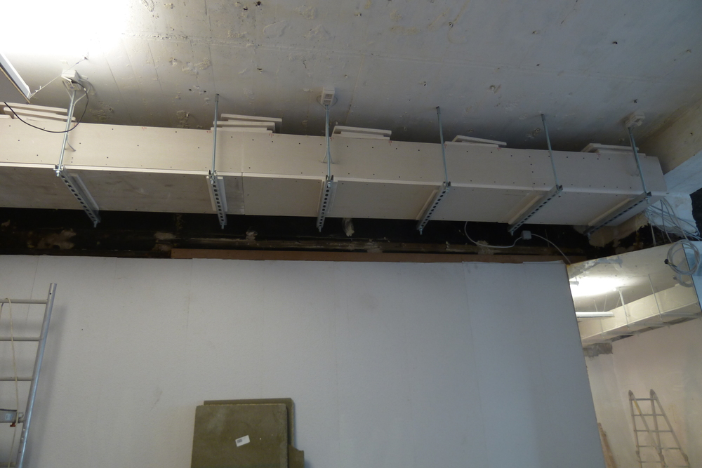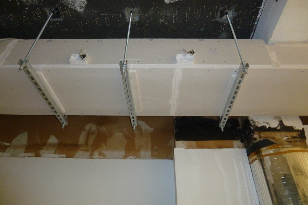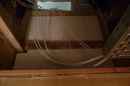 Im Kabelkanal im Hauptraum sind mittlerweile alle Kabel verlegt, deshalb wurde heute damit begonnen, die Übergänge zur Wand zu verkasten. Die Arbeit in diesen kleinen Ecken ist natürlich sehr mies, deshalb ist die Verkastung auch noch nicht fertig.