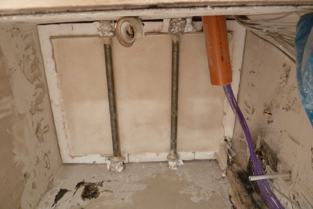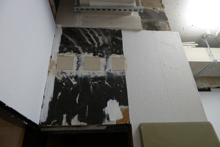 Die ehemaligen Lüftungslöcher über der Herrentoilette sind nun verputzt, so dass der Rest der Wand morgen tapeziert werden kann.