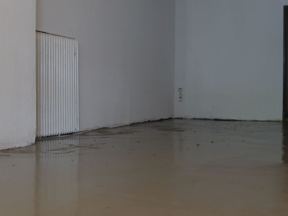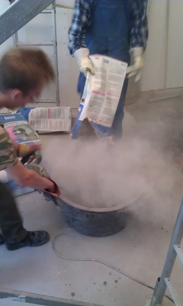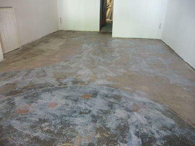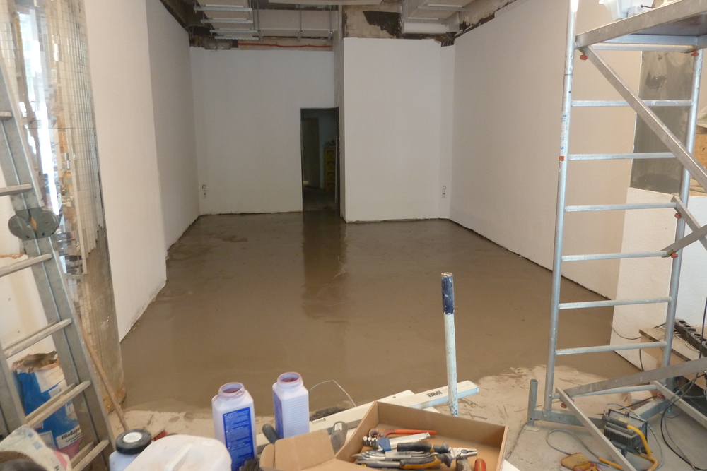Die andere Hälfte des Hauptraums hat nach Grundierung und (überraschend staubigem) Anmischen von Pampe nun einen überwiegend glatten Boden.
