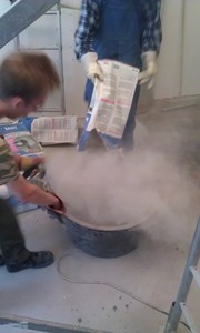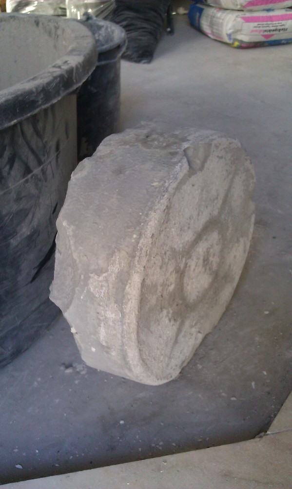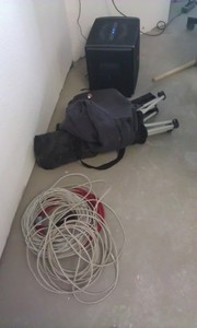 Aus der Kategorie Lost & Found: Campequipment wartet auf Abholung, Riesenstück Fließestrich wartet (nachdem er mit ausreichend Gewalt aus einem Eimer entfernt wurde) auf Entsorung.