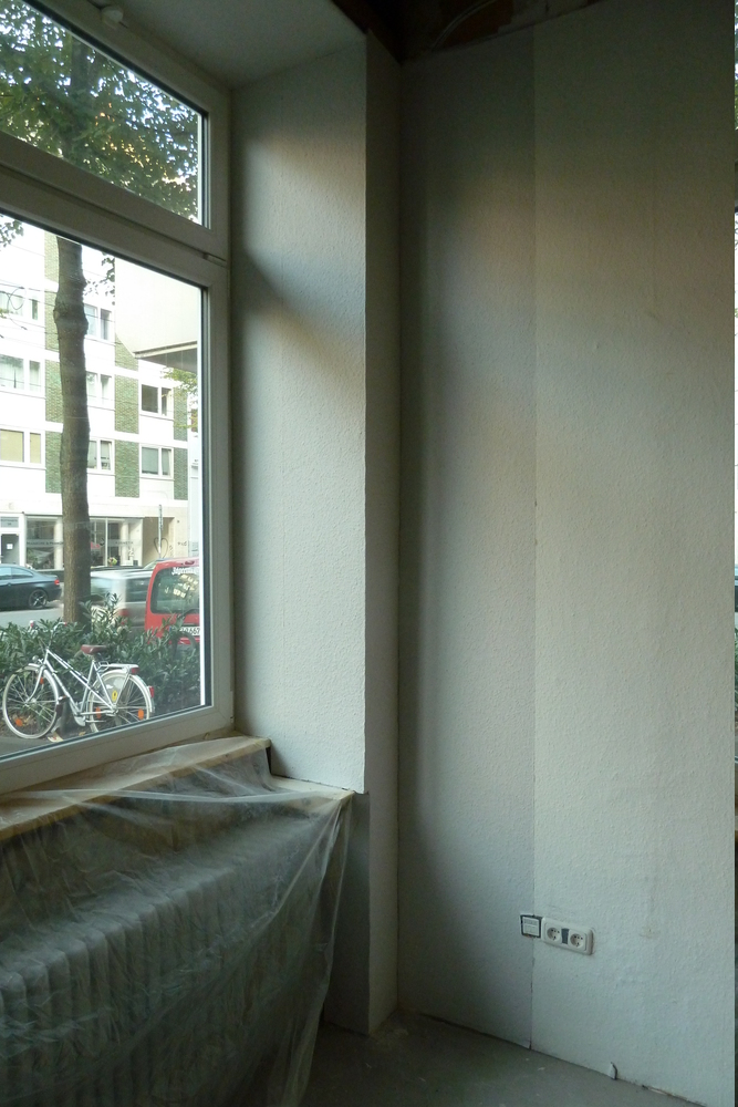 Die Wand um das Fenster ist nun nicht nur glatt, sondern sogar tapeziert.